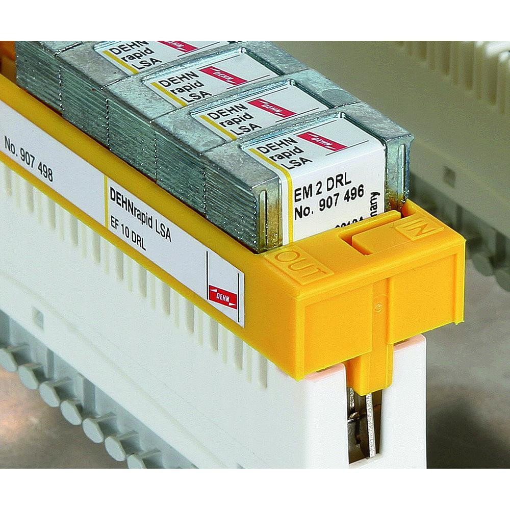 Skratovací modul, zasunutý do uzemňovacieho rámu EF 10 DRL, umožňuje ľahké prepojenie dvoch neosadených žíl a ich pripojenie na vyrovnanie potenciálov. Toto opatrenie slúži na priame uzemnenie žíl, ktoré nie sú využité, ale sú pripojené k rozpojovacej svo