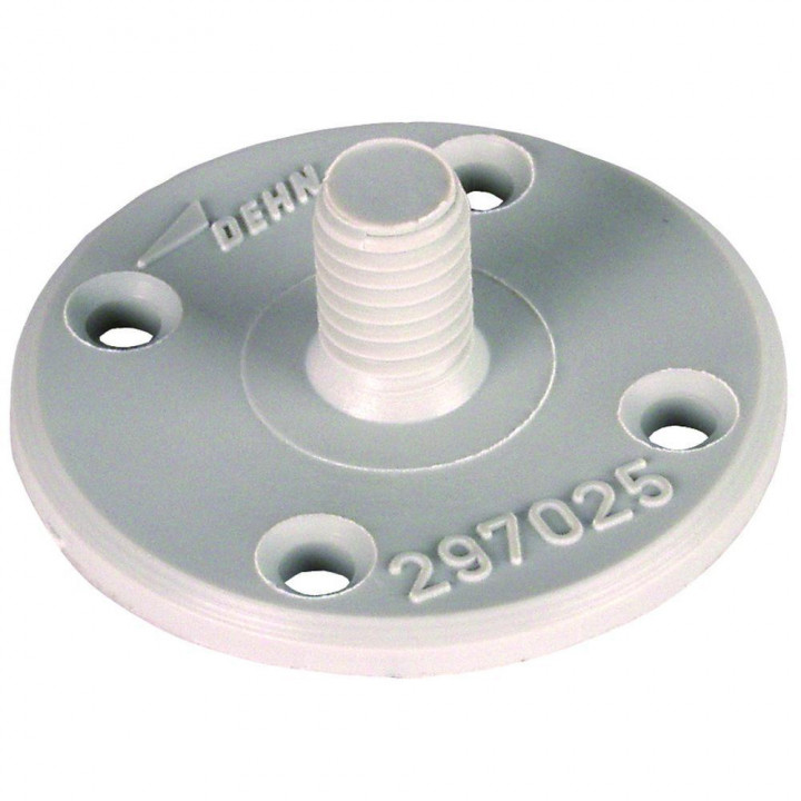 Kruhová montážna základňa, umelá hmota, malá Základňa so svorníkom M8 pre držiaky vedenia napr. DEHNsnap alebo DEHNhold. Vhodná pre betónové, lepenkové a plechové steny a strechy.