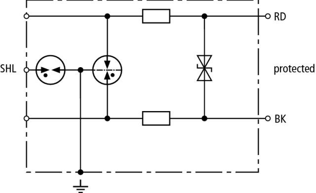 Energeticky skoordinovaný dvojstupňový zvodič prepätia s bleskoistkami a diódami proti zemi. Chráni dvojdrôtové nesymetrické rozhrania. Koncovka má závit NPT ½ -14 (vonkajší/vonkajší). Priechodné uzemňovacie vedenie.