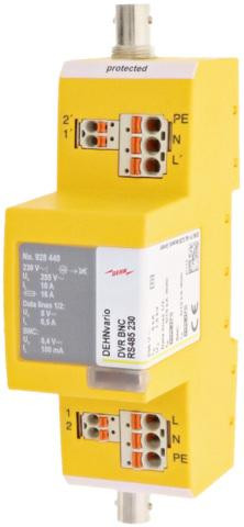 Kompaktný zvodič prepätia 3 v 1 na ochranu analógových kamerových systémov. Chráni videosignál (konektory BNC), dátový signál (RS485) a napájacie napätie (230 V AC). Rýchla montáž bez pomoci nástrojov, s nástrčnými svorkami. Pripojovacie bloky je možné uv