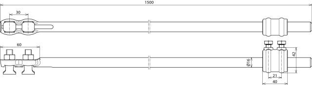 Kompletná sada zavádzacej tyče, skúšobnej svorky a pripojovacími svorkami KS. Prevedenie FeZn. Dĺžka zavádzacej tyče L = 1500 mm. Priemer zavádzacej tyče D = 16 mm.