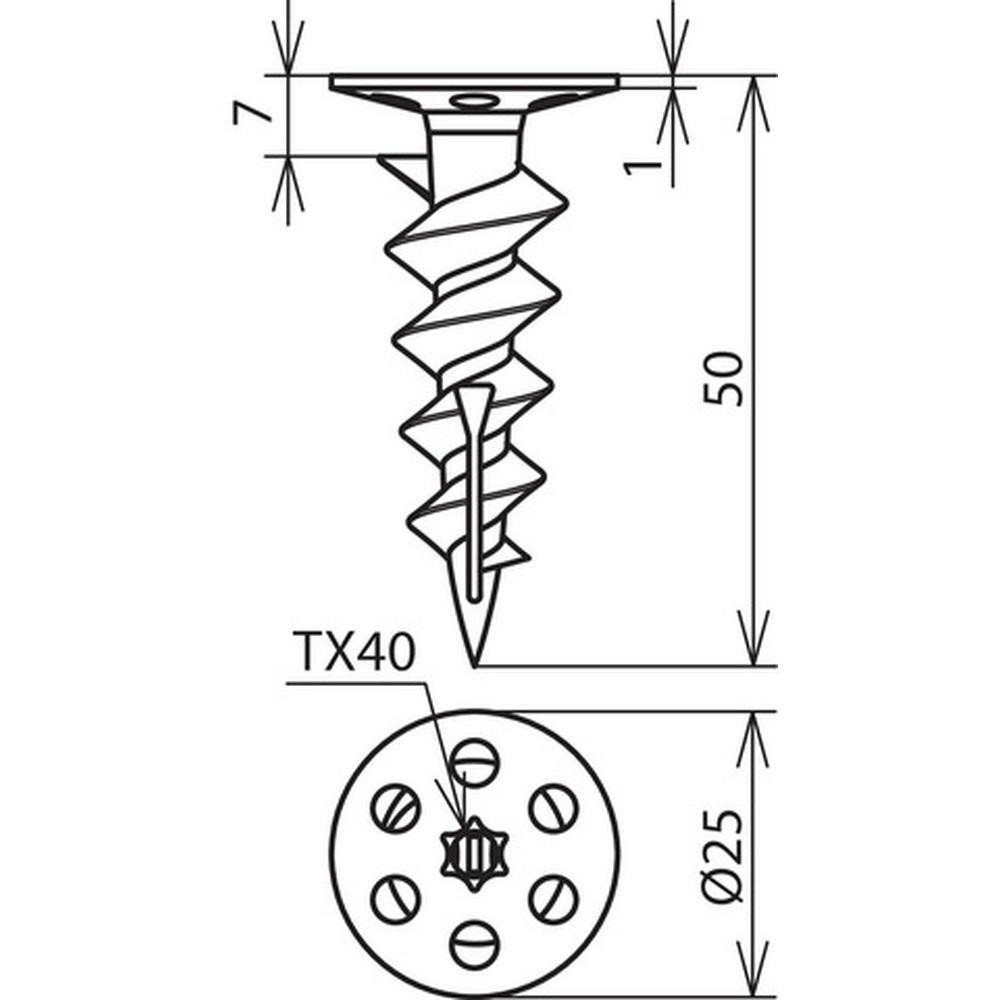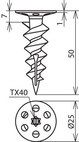 Hmoždinka do dosiek z tvrdenej penovej hmoty, slúži k uchyteniu držiakov vedenia do zateplovacieho systému. Aplikácia pomocou nadstavca (TX40). Pripevnenie držiaku pomocou skrutky do dreva d = 4,5 mm. Tieto hmoždinky sú určené pre uchytenie podpier ved