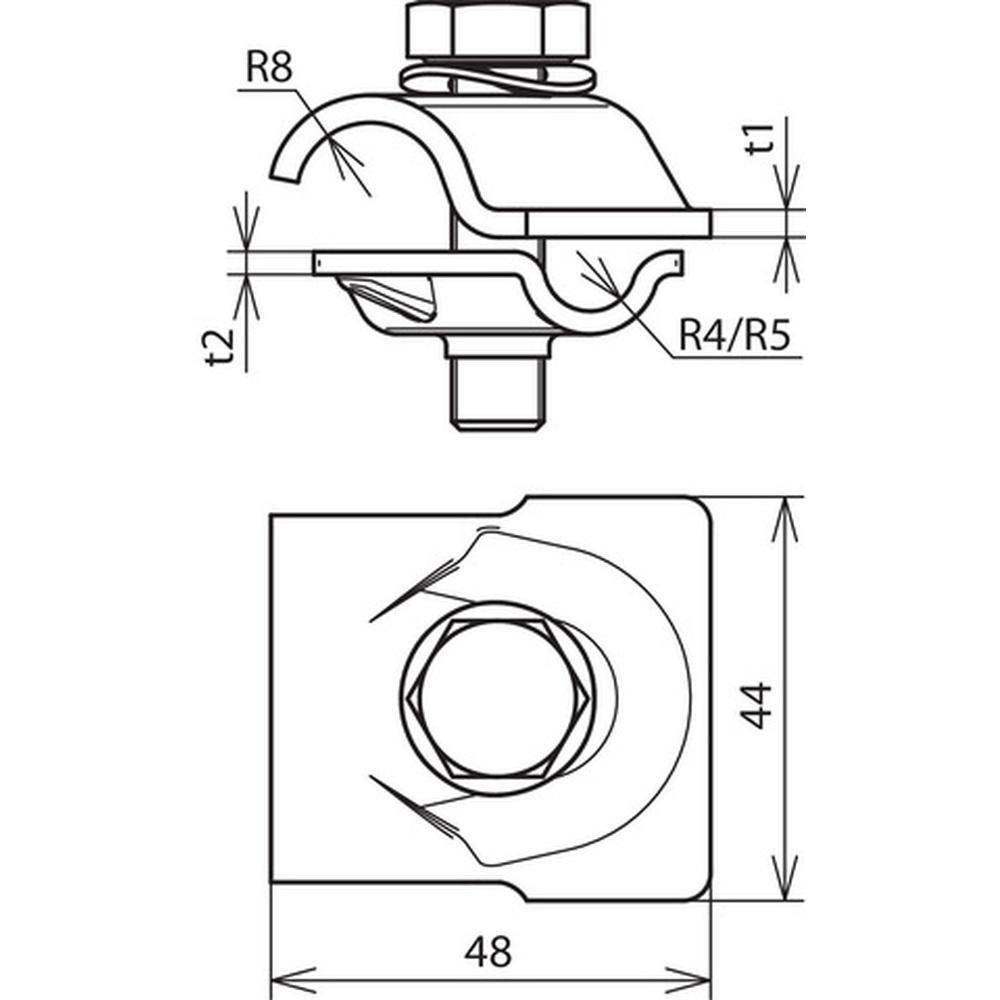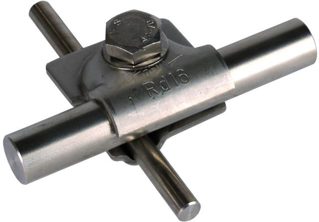 Svorka MV pre zachytávacie tyče. Viacúčelová prepojovacia svorka pre univerzálne použitie ako krížová, "T" a paralelná svorka. Dvojdielna svorka so skrutkou so šesťhrannou hlavou, pérovou podložkou a závitom v podnej časti. Materiál svorky - nerez. Ro