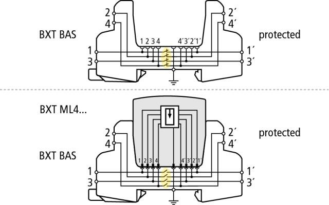 BLITZDUCTOR XT – základný diel, je priestorovo veľmi úsporná štvorpólová priechodná svorka pre iskrovo bezpečné obvody, určená na uchytenie ochranného modulu, bez prerušenia signálu pri jeho vysunutí. Bezpečné uzemnenie modulov zvodičov prepätia je zaiste