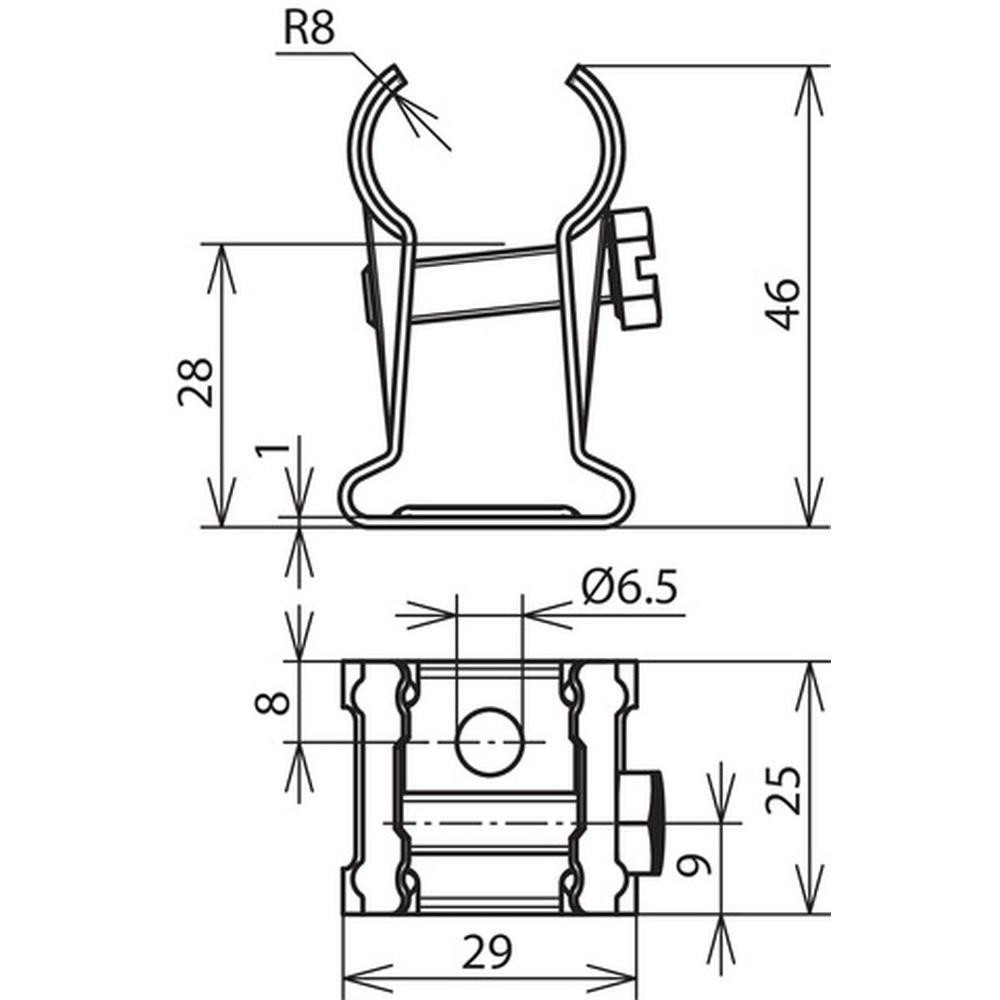Pre upevnenie na stenu so sťahovacou skrutkou M6. Zabezpečuje pevné uchytenie tyče. Priemer tyče D = 16 mm. Otvor pre priskrutkovanie 6,5 mm