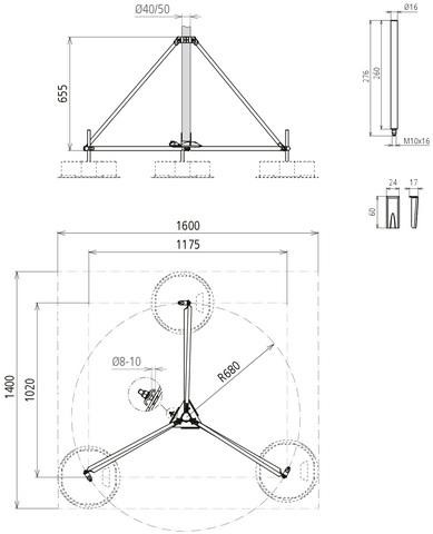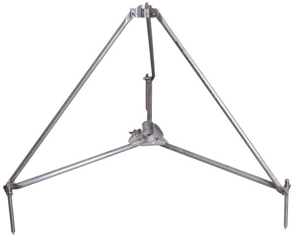 Tříramenný stojan (rozkládací verze) pro podpůrné trubky D 50 mm se stranovým vývodem nebo s redukcí pro jímací tyče D 40 mm. S dvojitou příložkou pro připojení dvou drátů prům. 8 - 10 mm, sestavení s betonovými podstavci (hmotnost 17 kg) a přizpůsobením