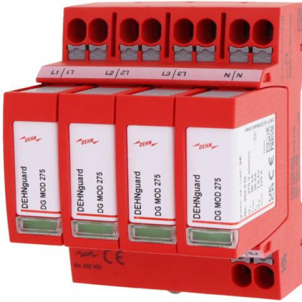 Vícepólový svodič přepětí DEHNguard MP, typ 2 + typ 3 podle EN 61643-11, skládající se ze základního dílu se zásuvnými ochrannými moduly a dvojité push-in připojovací svorky pro rozvětvené a průchozí zapojení. Vysoký stupeň bezpečnosti je zajištěn monitor