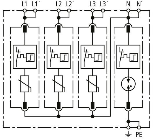 Vícepólový svodič přepětí DEHNguard MP, typ 2 + typ 3 podle EN 61643-11skládající se ze základního dílu se zásuvnými ochrannými moduly a dvojité push-in připojovací svorky pro rozvětvené a průchozí zapojení. Vysoký stupeň bezpečnosti je zajištěn monitorov