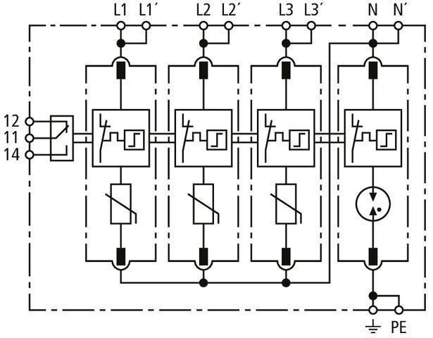 Vícepólový svodič přepětí DEHNguard MP, typ 2 + typ 3 podle EN 61643-11skládající se ze základního dílu se zásuvnými ochrannými moduly a dvojité push-in připojovací svorky pro rozvětvené a průchozí zapojení. Vysoký stupeň bezpečnosti je zajištěn monitorov