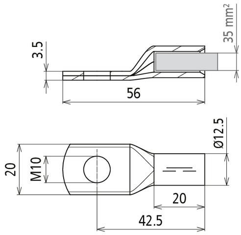 Lisovací kabelové oko podle DIN 46235, průřez 35 mm² M10 Cu/gal Sn s niklovou bariérovou vrstvou. Aby se zabránilo tvorbě "vousů" v Ex prostředí, doporučuje se použití pocínovaných nalisovaných kabelových ok s niklovou bariérovou vrstvou.