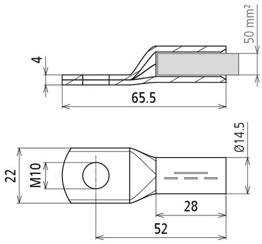 Lisovací kabelové oko podle DIN 46235, průřez 50 mm² M10 Cu/gal Sn s niklovou bariérovou vrstvou. Aby se zabránilo tvorbě "vousů" v Ex prostředí, doporučuje se použití pocínovaných nalisovaných kabelových ok s niklovou bariérovou vrstvou.