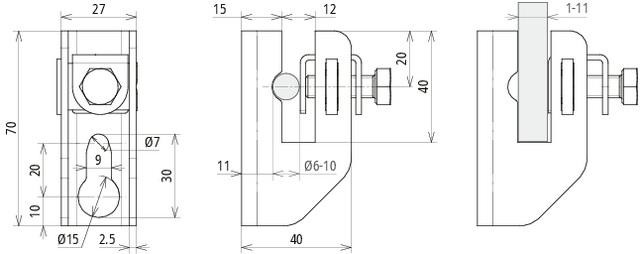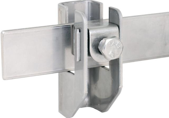 Držák vedení s přítlačným mechanizmem (šroub M8), pro uložení pásku do 11 mm a drátu 6 - 10 mm, pevné uchycení vedení. Provedení s odstupem od zdi 15 mm.