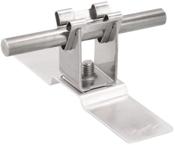 Střešní držák vedení pro upevnění přídavné jímací soustavy na plechové střechy. Tvarovatelné provedení s hliníkovou vzpěrou a lepicí podložkou, např. pro střechy z trapézového a vlnitého plechu, s držákem vedení DEHNgrip, volné uchycení vedení, plast odol