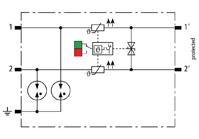 Prostorově úsporný, modulární kombinovaný svodič o šířce 6 mm a připojovací technologií push-in, s ukazatelem stavu, pro ochranu 1 páru vedení v systémech 24 V DC. Instalace je možná i při uzemněném záporném pólu. Integrované odpory PTC umožňují bezpečné