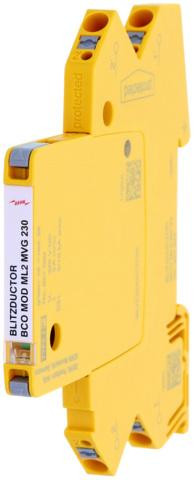 Prostorově úsporný, modulární kombinovaný svodič o šířce 6 mm a připojovací technologií push-in, s ukazatelem stavu, pro ochranu 2 vodičů vícežilových bezpotenciálových signálových rozhraní se jmenovitým napětím 230 V. S rozpojením signálových cest pro úč