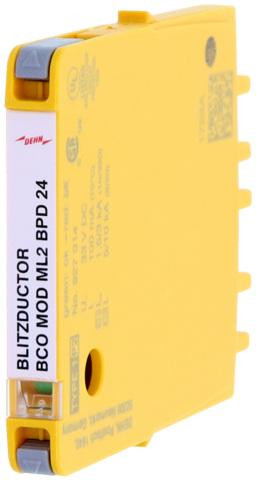 Ochranný modul kombinovaného svodiče o šířce 6 mm pro BLITZDUCTORconnect, s ukazatelem stavu, pro ochranu 1 páru vedení v systémech 24 V DC. S rozpojením signálových cest pro účely údržby. Instalace je možná i při uzemněném záporném pólu. Integrované odpo