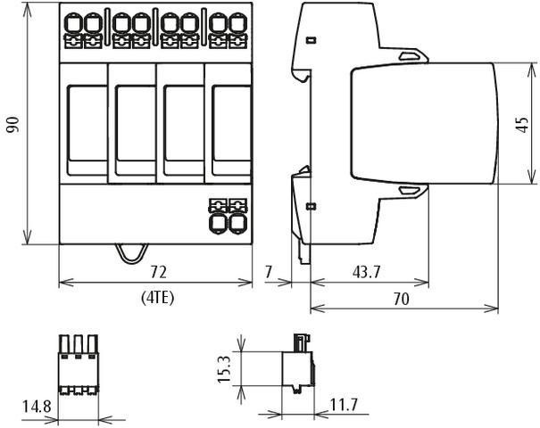Vícepólový svodič přepětí DEHNguard M ACI, typ 2 podle EN 61643-11 s integrovanou kombinací ACI spínač/jiskřiště, skládající se ze základního dílu se zásuvnými ochrannými moduly a dvojité push-in připojovací svorky pro rozvětvené a průchozí zapojení. Vyso