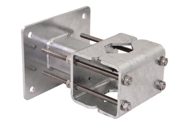Upevnění stožáru pro montáž na stěnu z FeZn pro vodorovnou montáž. Pro upevnění větších jímacích tyčí D= 55-100 mm na chráněnou konstrukci nebo na stěnu pomocí závitových tyčí. Opatřeno podélnými otvory pro montáž.
